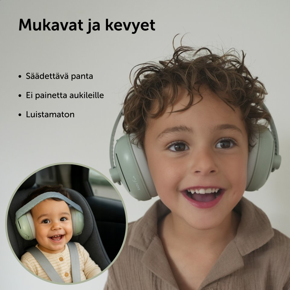 Kuulmiskaitse kinnitatakse hõlpsasti kaasas oleva peakomplekti külge, tagades kindla ja mugava istuvuse. Komplektis on kaks erinevat peakomplekti: pehme, reguleeriv, libisemisvastane beebidele (0–12 kuud) ja fikseeritud peakomplekt väikelastele (12–48 kuud).