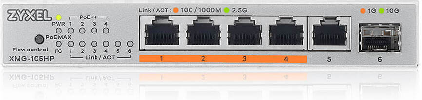 ZyXEL XMG-105HP on 5-porttinen 2.5 Gigabitin ethernet kytkin, joka soveltuu hyvin pieneen koti- tai lähiverkkoon. ZyXEL XMG-105HP kaikki viisi porttia tukevat 2.5G nopeutta. Laite tunnistaa siihen liitettyjen verkkolaitteiden nopeuden ja duplex tilan automaattisesti joten käyttöönotto on nopeaa ja helppoa.
