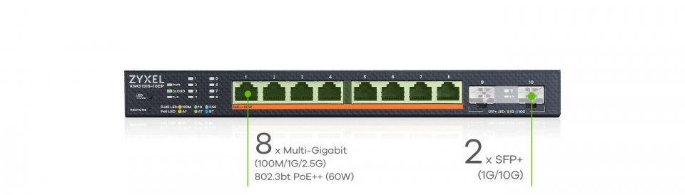 ZyXEL XMG1915-10EP on hallittava PoE-kytkin, joka sopii hyvin pienten ja keskisuurten yritysten verkon nopeuden ja suorituskyvyn parantamiseen. Sen avulla voit nostaa verkon nopeuden jopa 2,5-kertaiseksi nykyisiin Gigabit-verkkoihin verrattuna ilman kalliita kaapelointimuutoksia. Laitteessa on kahdeksan 2,5 GbE -porttia, joista kahdeksassa on myös PoE++ -tuki, joten voit helposti liittää ja virransaada esimerkiksi PTZ-kameroita, WiFi 6/6E -reitittimiä ja muita IoT-laitteita. Lisäksi kaksi 10G SFP+ -porttia mahdollistavat nopeat yhteydet palvelimiin tai muihin kytkimiin.